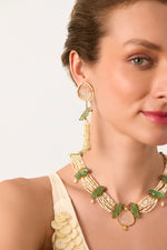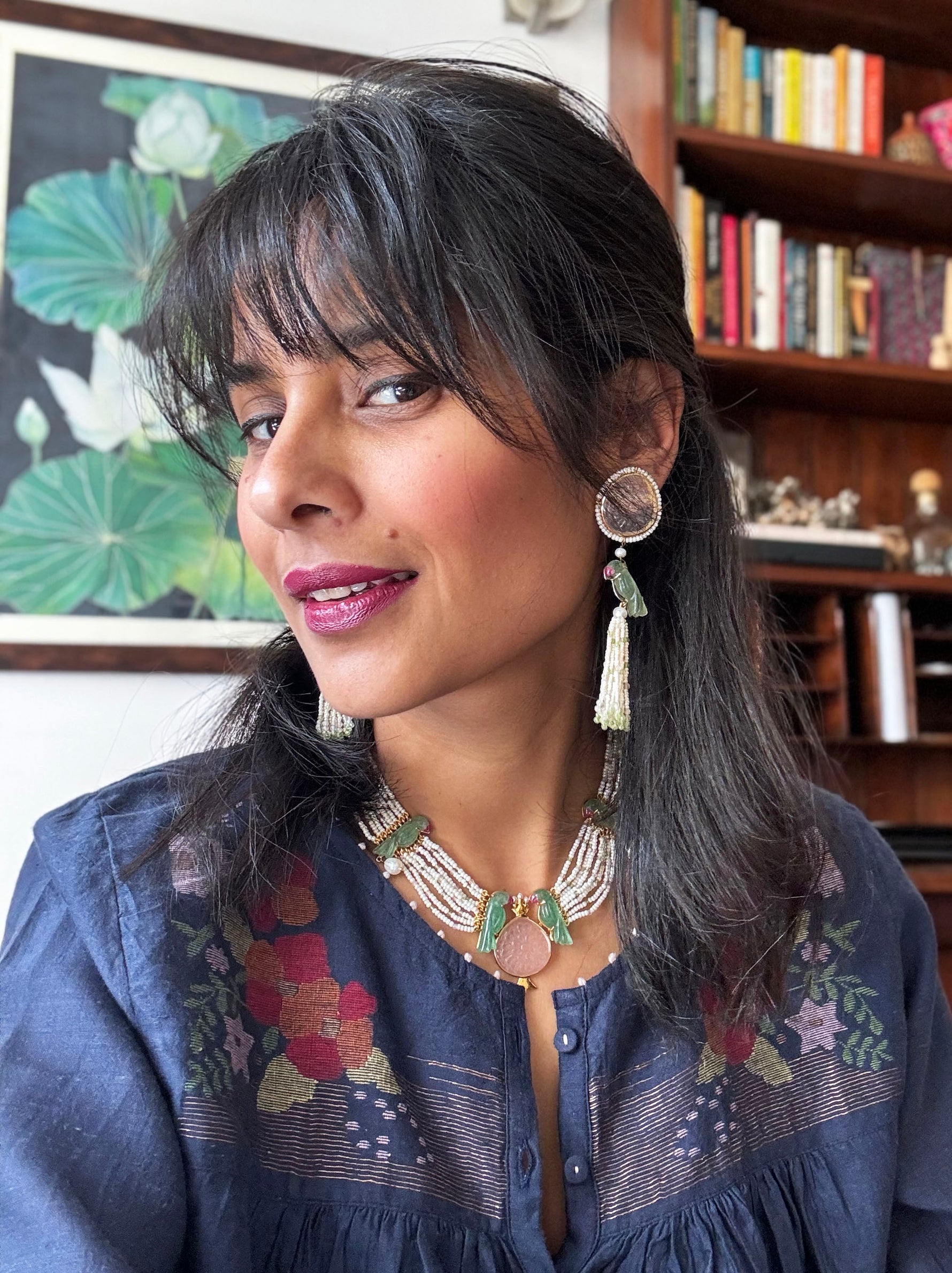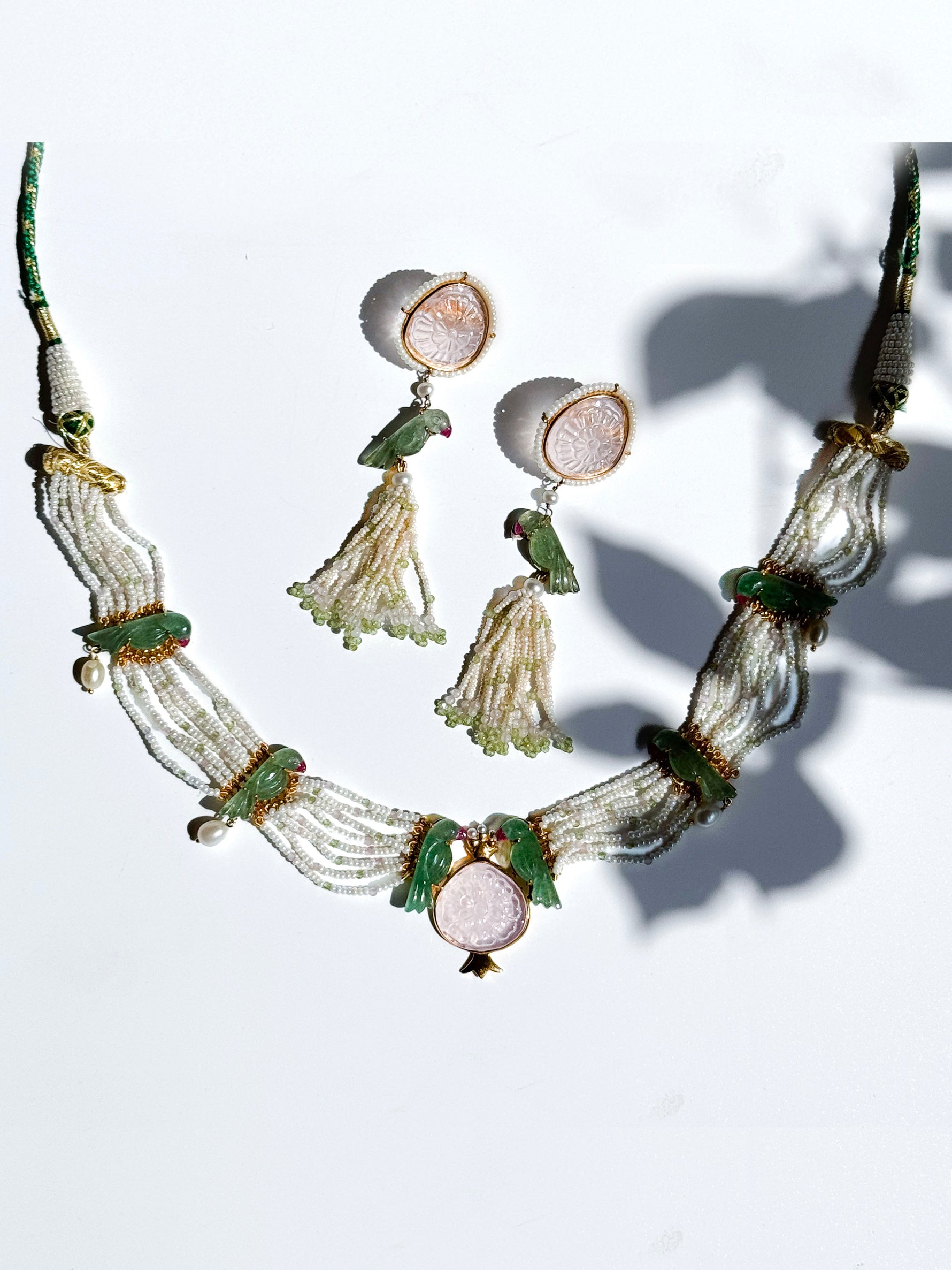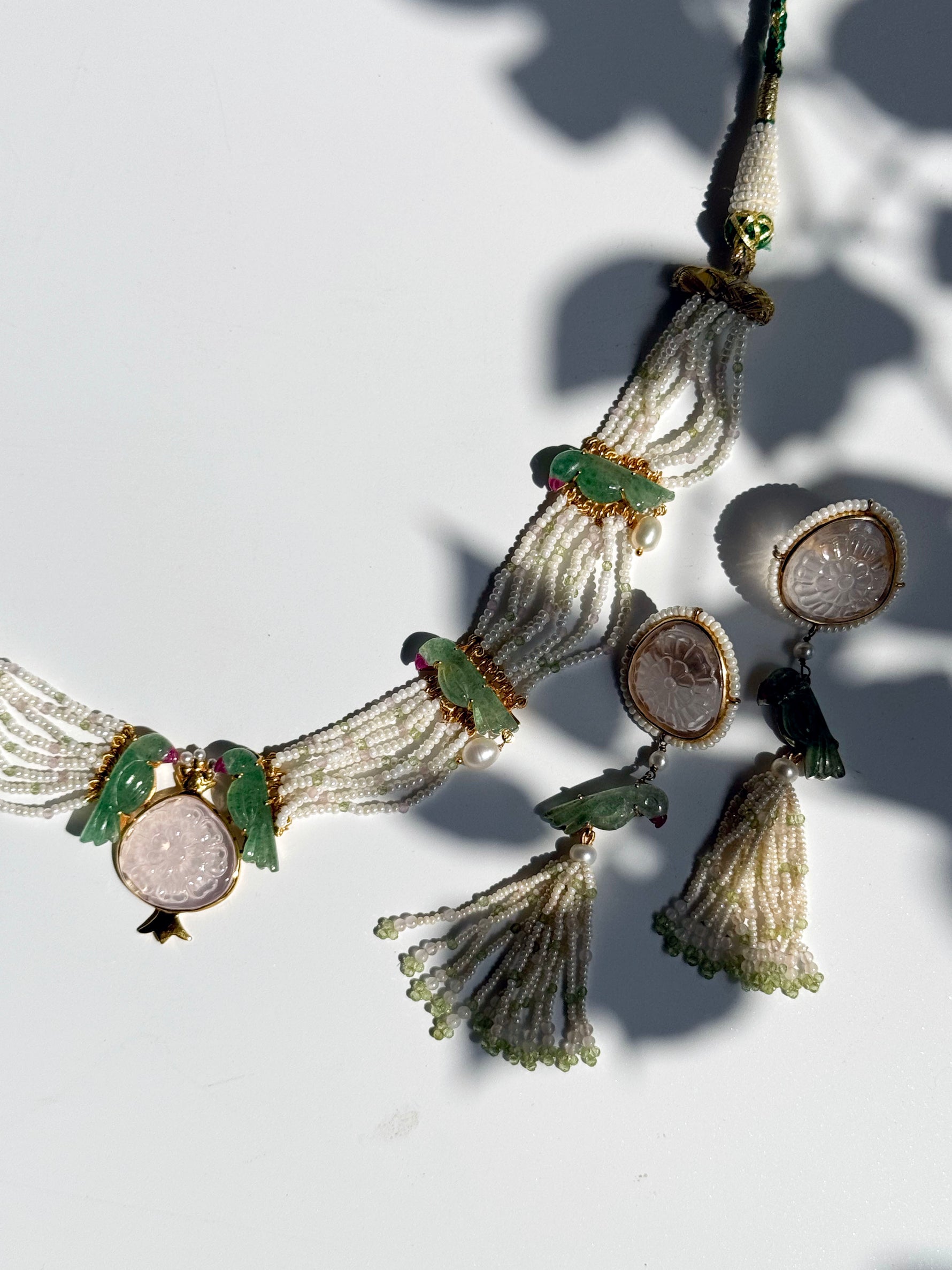 Artist conceptualised & crafted with impeccable artisanal skill. This necklace is made with hand carved Rose Quartz & Aventurine semi precious stones with a Ruby beak for the parrots.