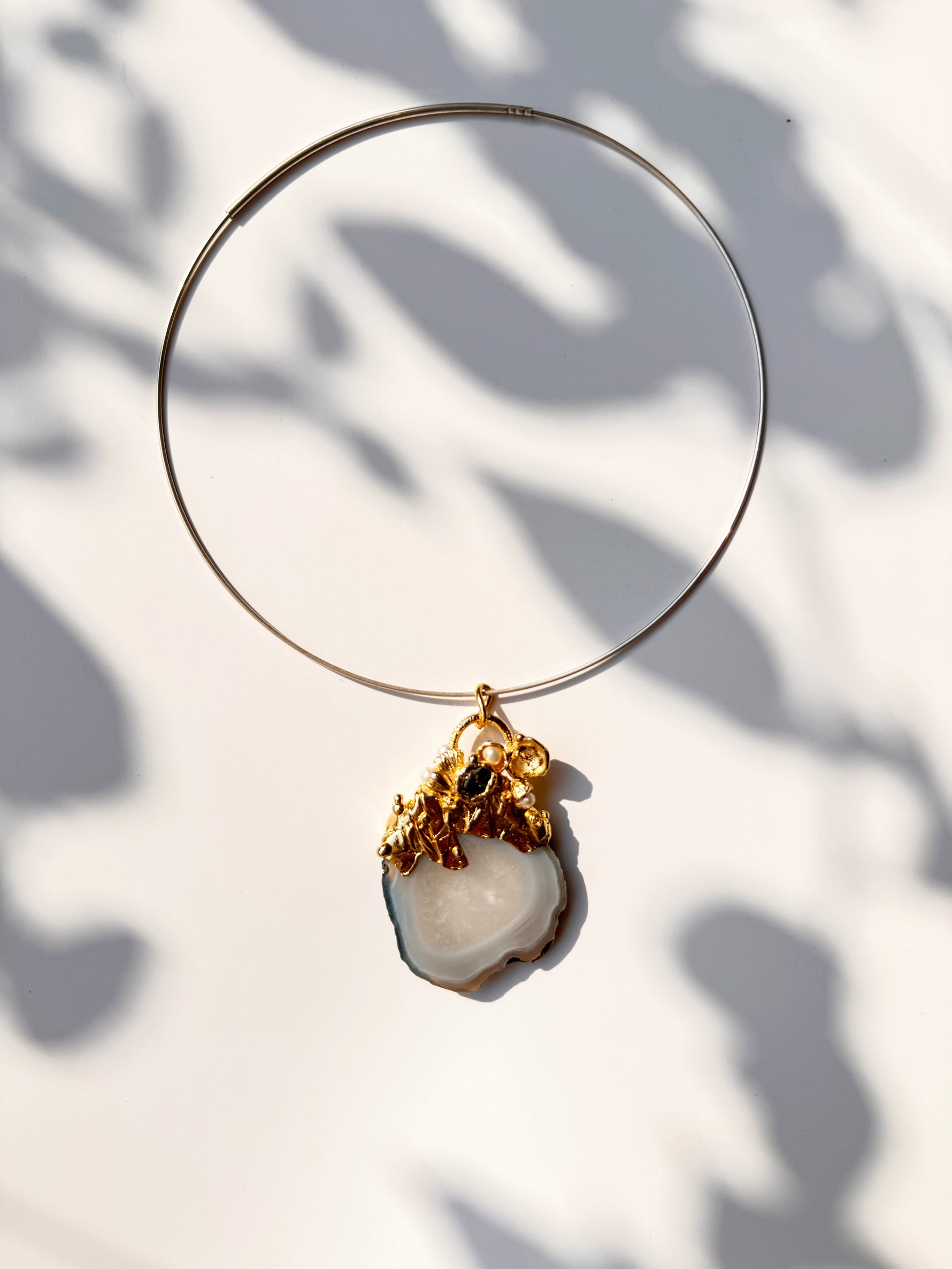 Natural Agate with keshi pearls, set in a hand sculpted brass metal with a gold polish. And a sterling silver Hasli.