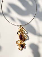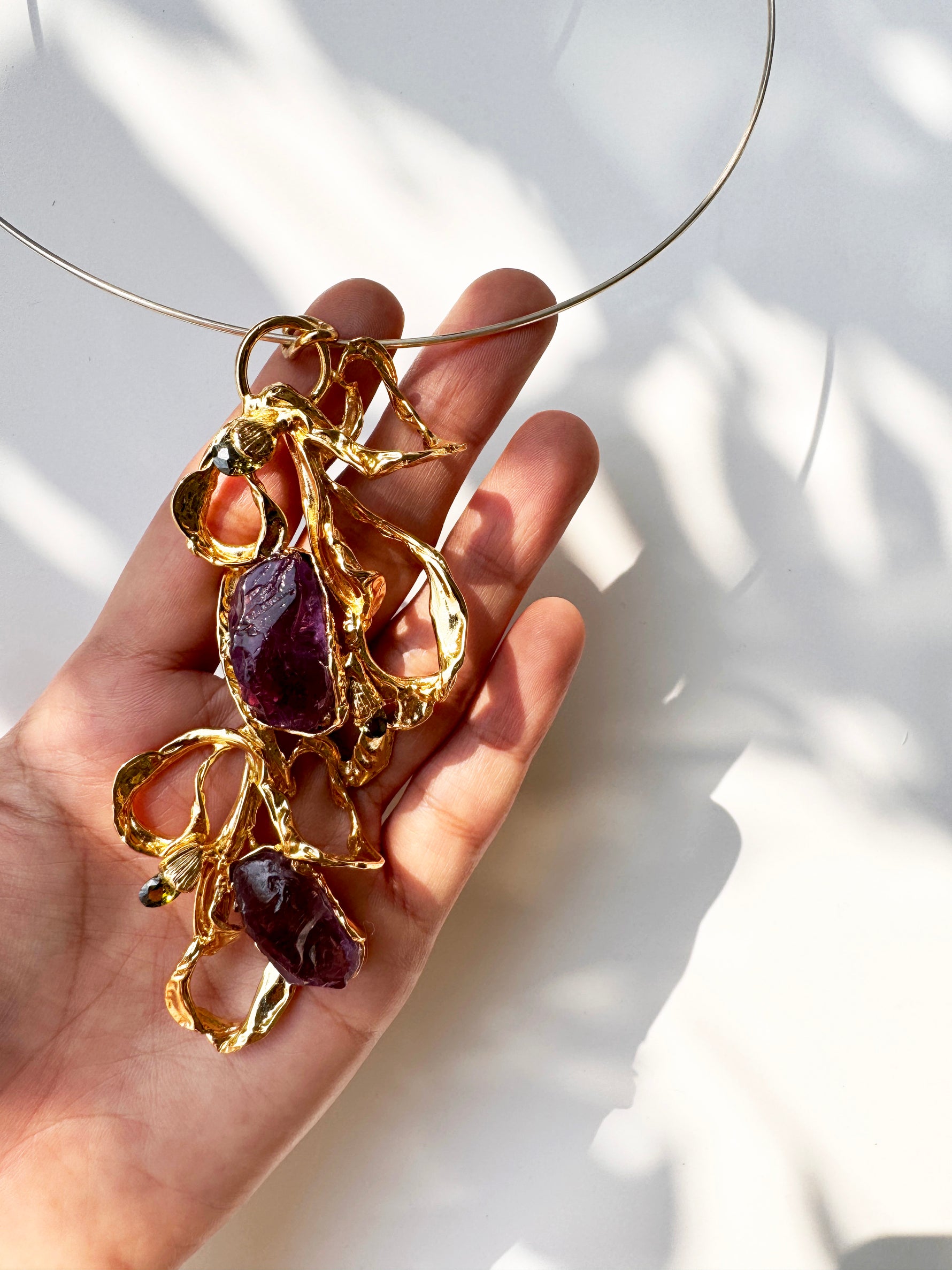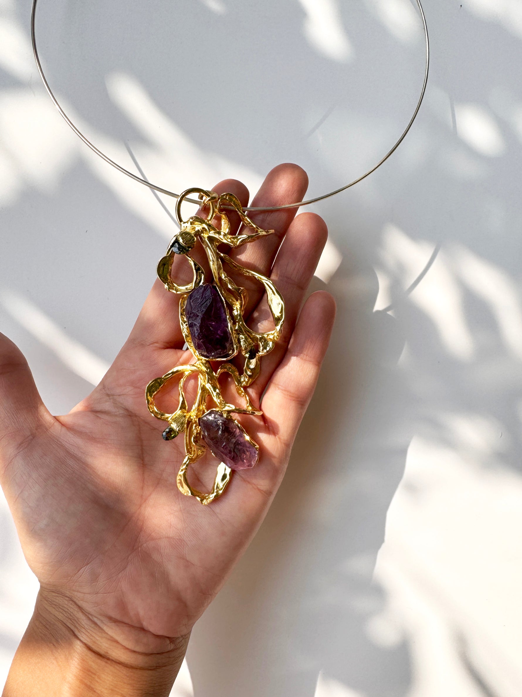 Natural Quartz set in a hand sculpted brass metal with a gold polish. And a sterling silver Hasli.