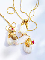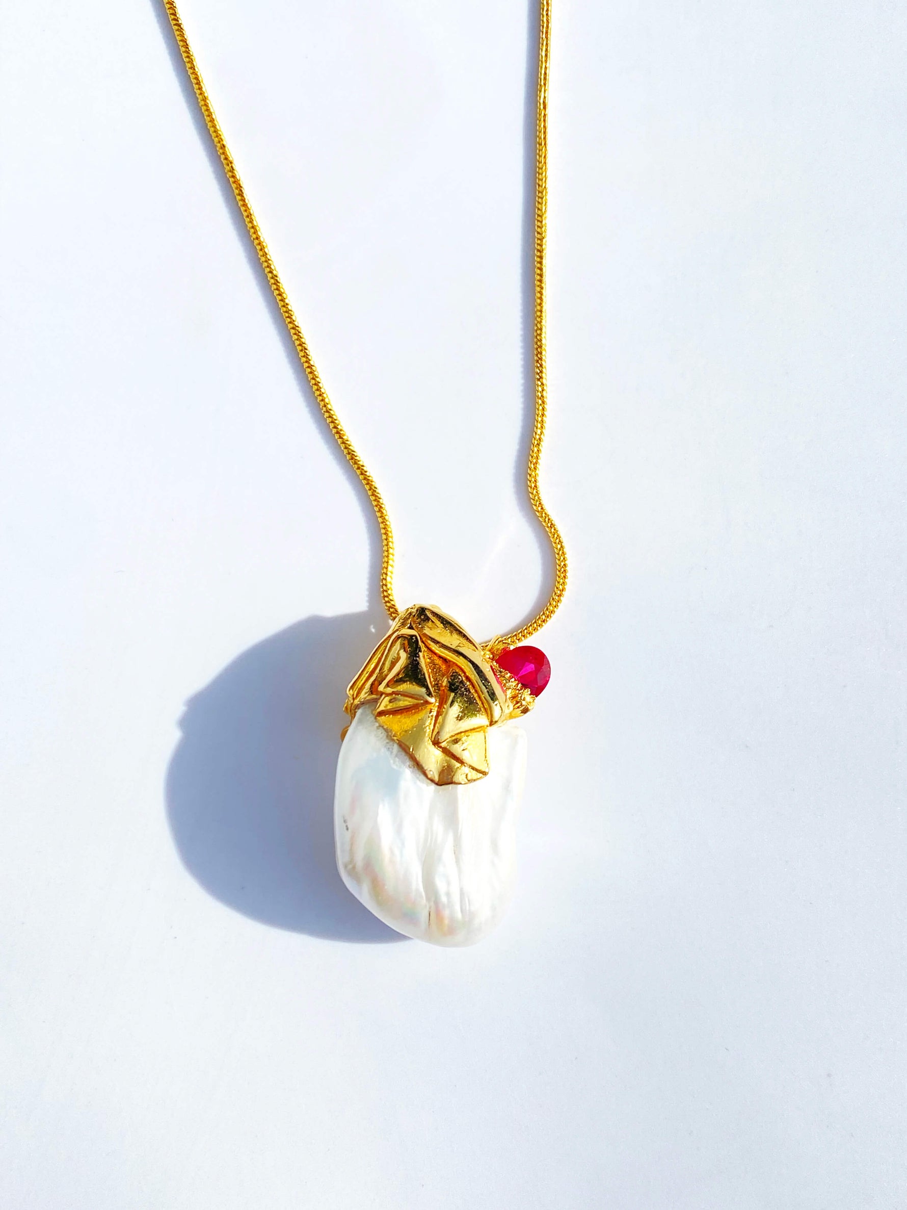 Entirely artist conceptualized & sourced individually, crafted personally. The irregular baroque fresh water pearl is hand picked & draped in brass metal dipped in Gold.