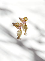 A cluster of semi precious hand carved flowers and  baroque pearl drops, these earrings are lightweight and beautifully delicate. Set in a gold dipped sterling silver frame, it's a classic and contemporary design for all seasons.