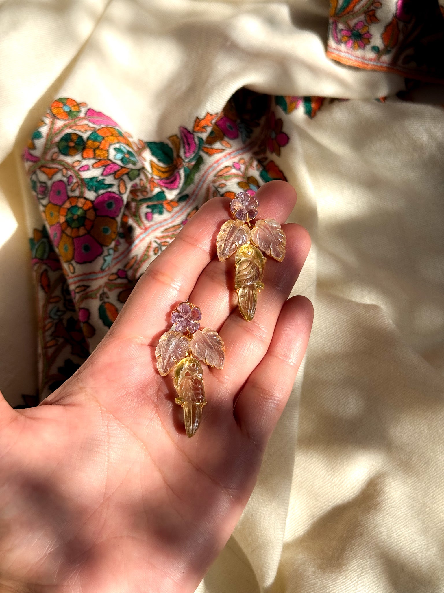 Hand carved florals in Amethyst, Rose quartz leaves with a Smoky Quartz bird. Set in gold dipped sterling silver frame.