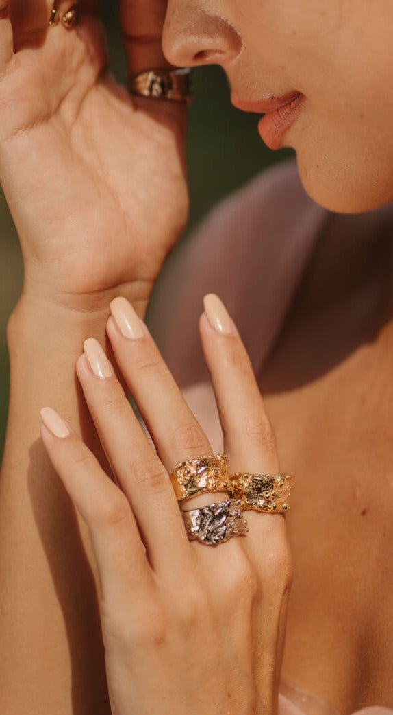 Inspired from the beautiful textures of corals and languid feel of underwater plants, each piece is an ode to nature. The chunky yet minimal ring that works beautifully as a single piece or stacked up to armour your fingers.