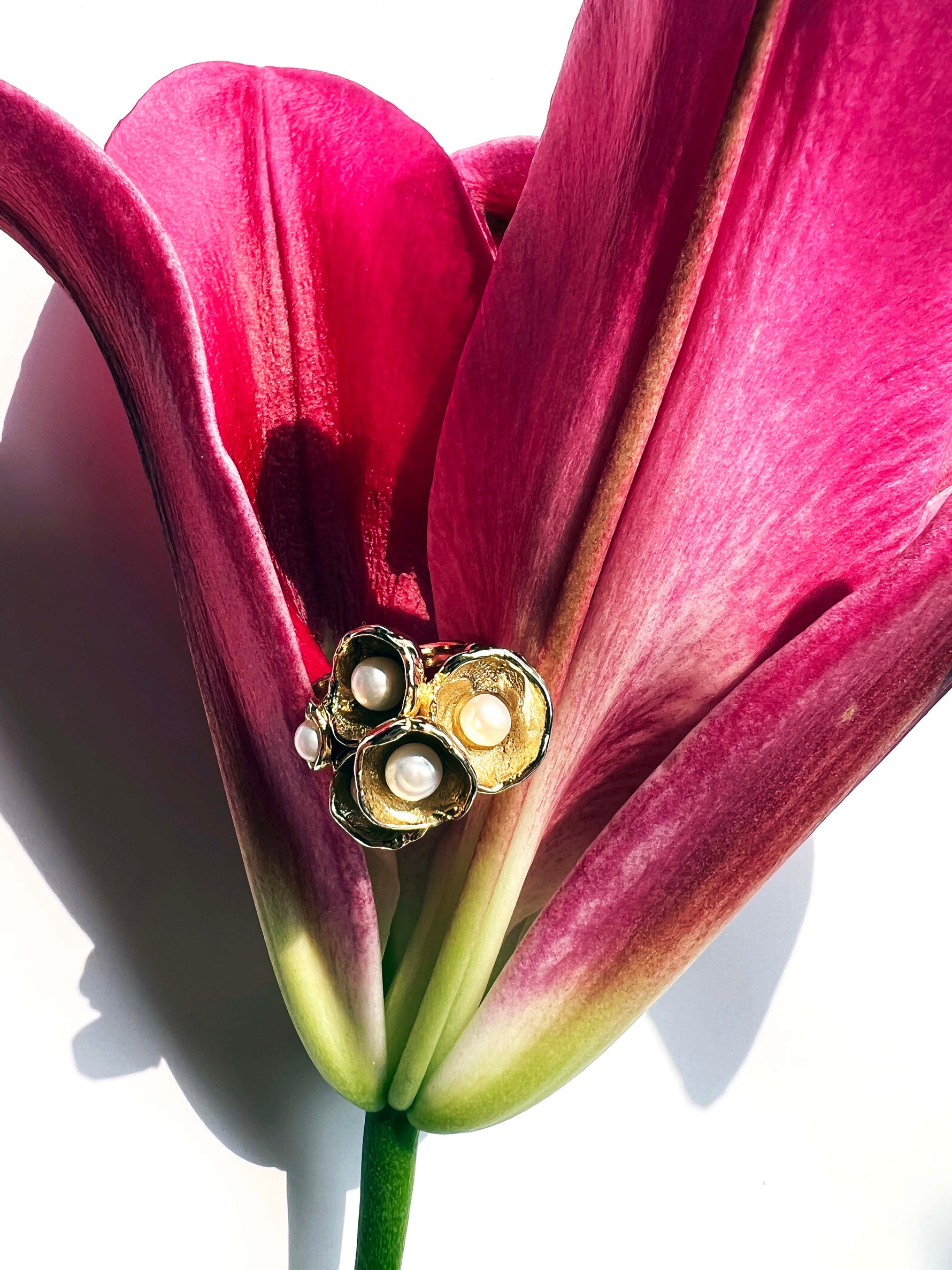 An intricately detailed ring with handpicked pearls. Wear an ocean on your finger, for a cheerful pick me up.
