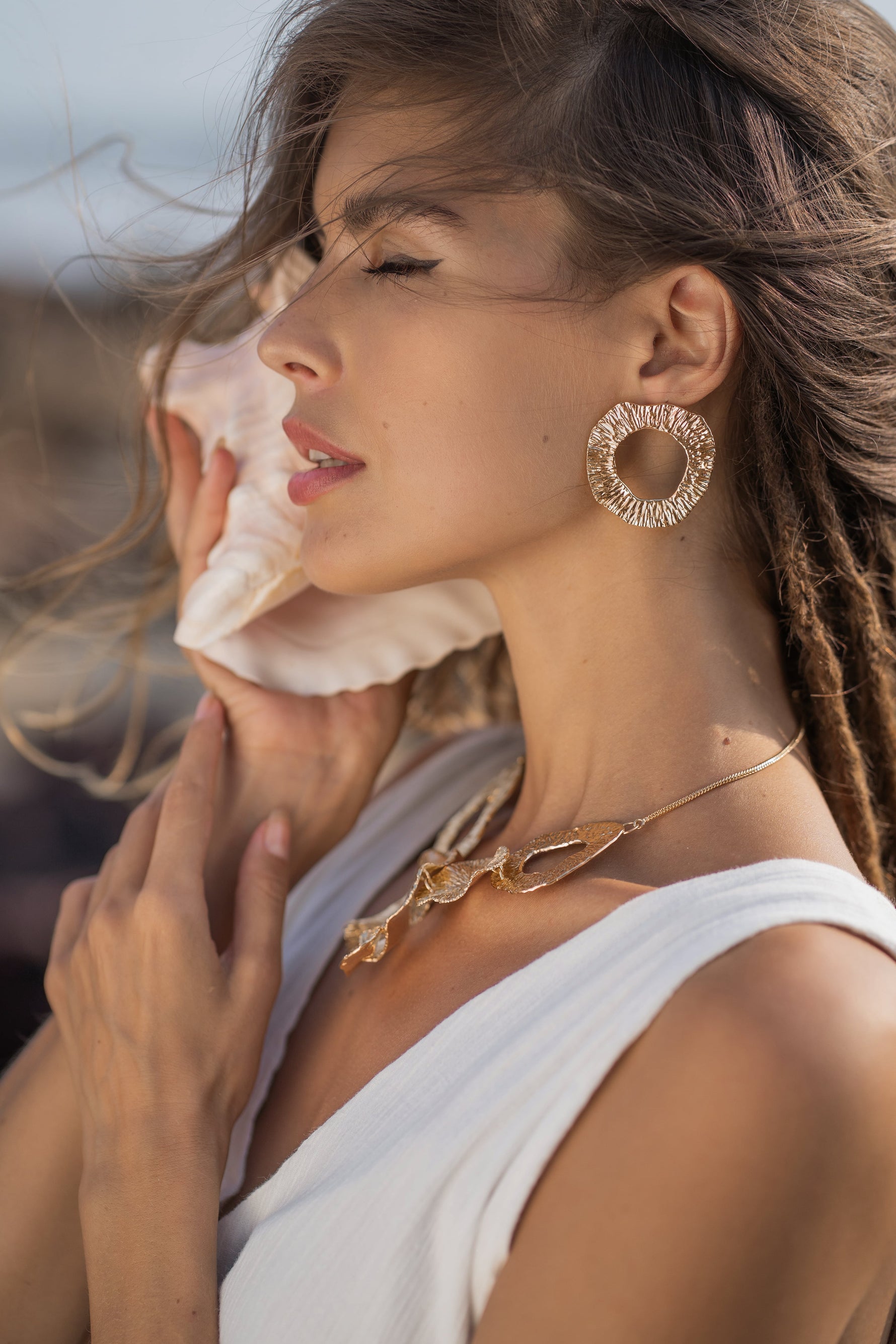 This collection explores dialogues from past explorations & serves as a bridge to our Spring Summer '20. With statement chokers & earrings, minimal earring studs, chunky hoops & cuffs, it is ideal for a cocktail evening. Each piece has been personally sculpted by hand and finished by skilled Indian artisans for you.