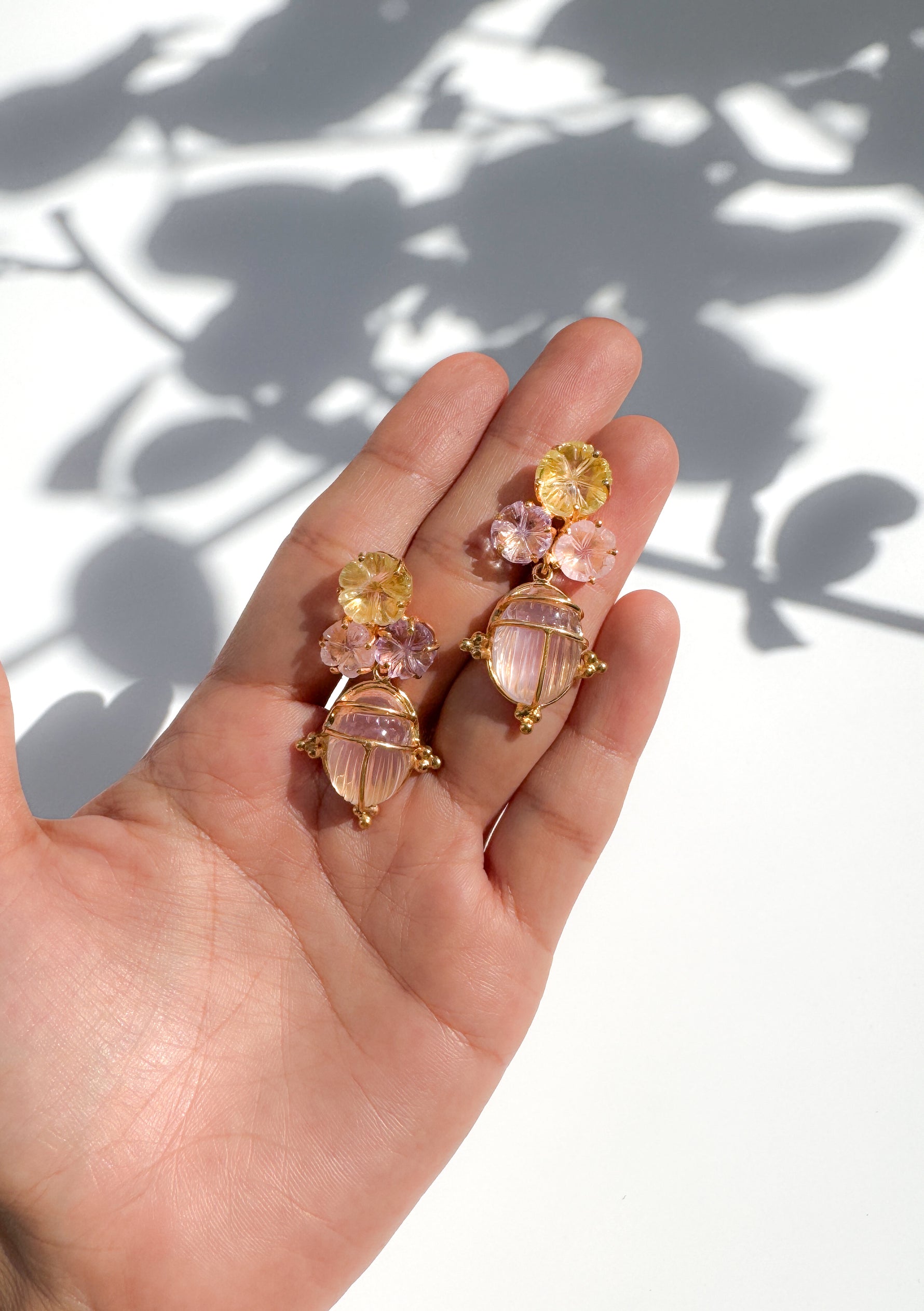 Hand carved florals in Lemon Topaz, Amethyst and Rose quartz with a Rose Quartz Beetle.