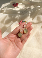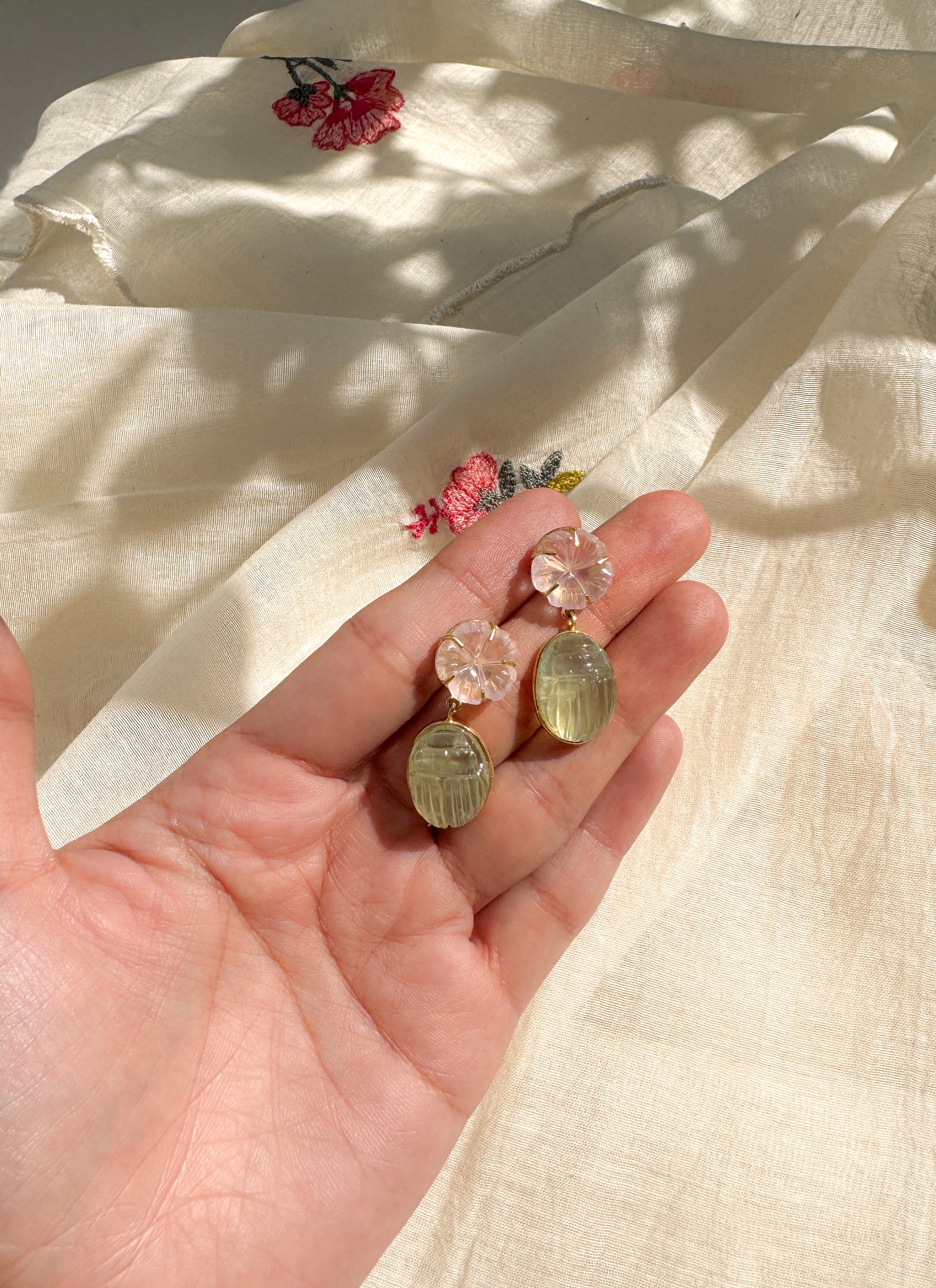 Delicate carved semi precious stones, these earrings are lightweight and minimal for everyday wear. Set in gold dipped sterling silver and set with Sage Quartz Beetles and Rose Quartz Florals.