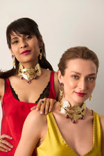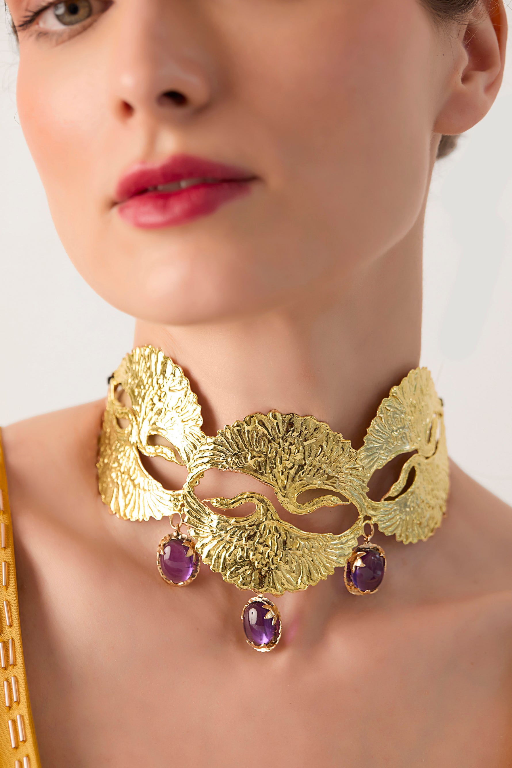 A flock of hand sculpted Swans caught in mid flight, inspired by Art Nouveau movement, this choker accentuated by drops of amethyst tone stones is a beautiful statement piece. It's quite broad on the neck but comfortable to wear, paired here with the Beetle earrings.