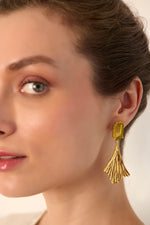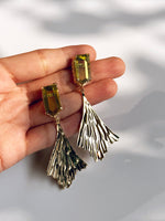 A rich olive hand craved stone with detailed leaf etched prongs makes it an exquisite piece set in gold toned brass. These earrings are lightweight and versatile to be worn from work to an evening out !