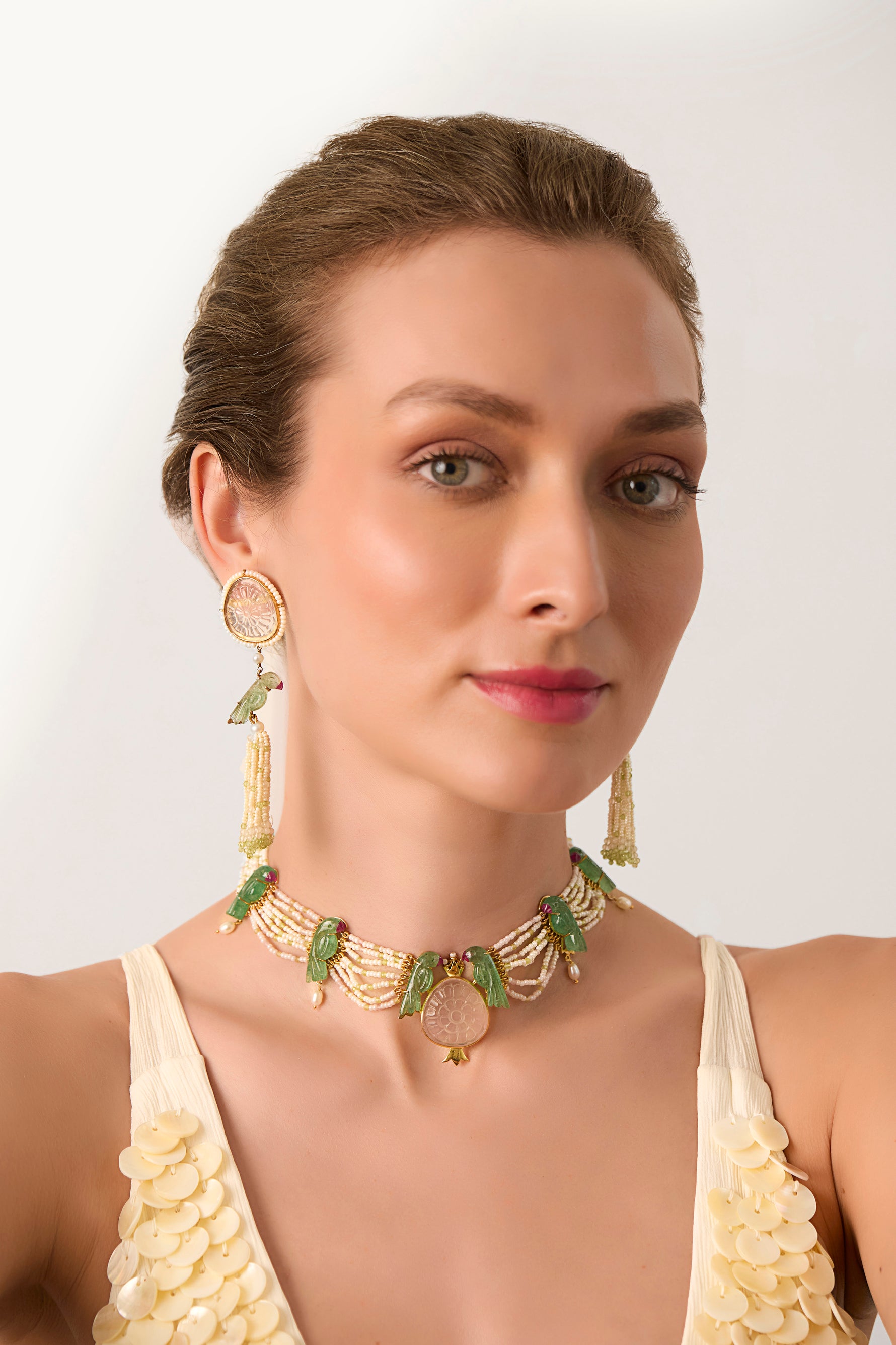 Artist conceptualised & crafted with impeccable artisanal skill. This necklace is made with hand carved Rose Quartz & Aventurine semi precious stones with a Ruby beak for the parrots.
