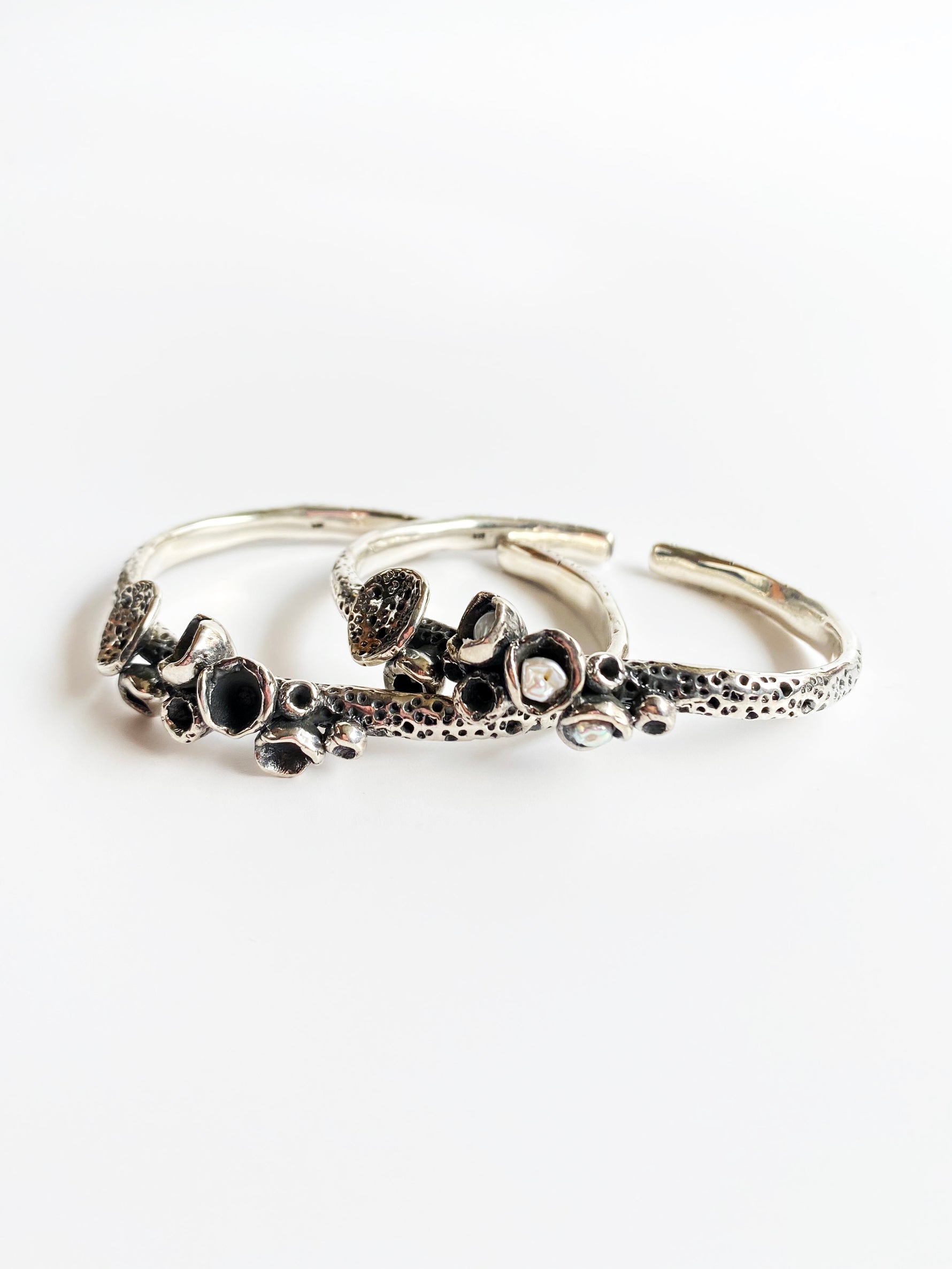 Composition : Hallmarked 92.7 sterling silver with keshi pearls & Oxidised finish. Adjustable bangle