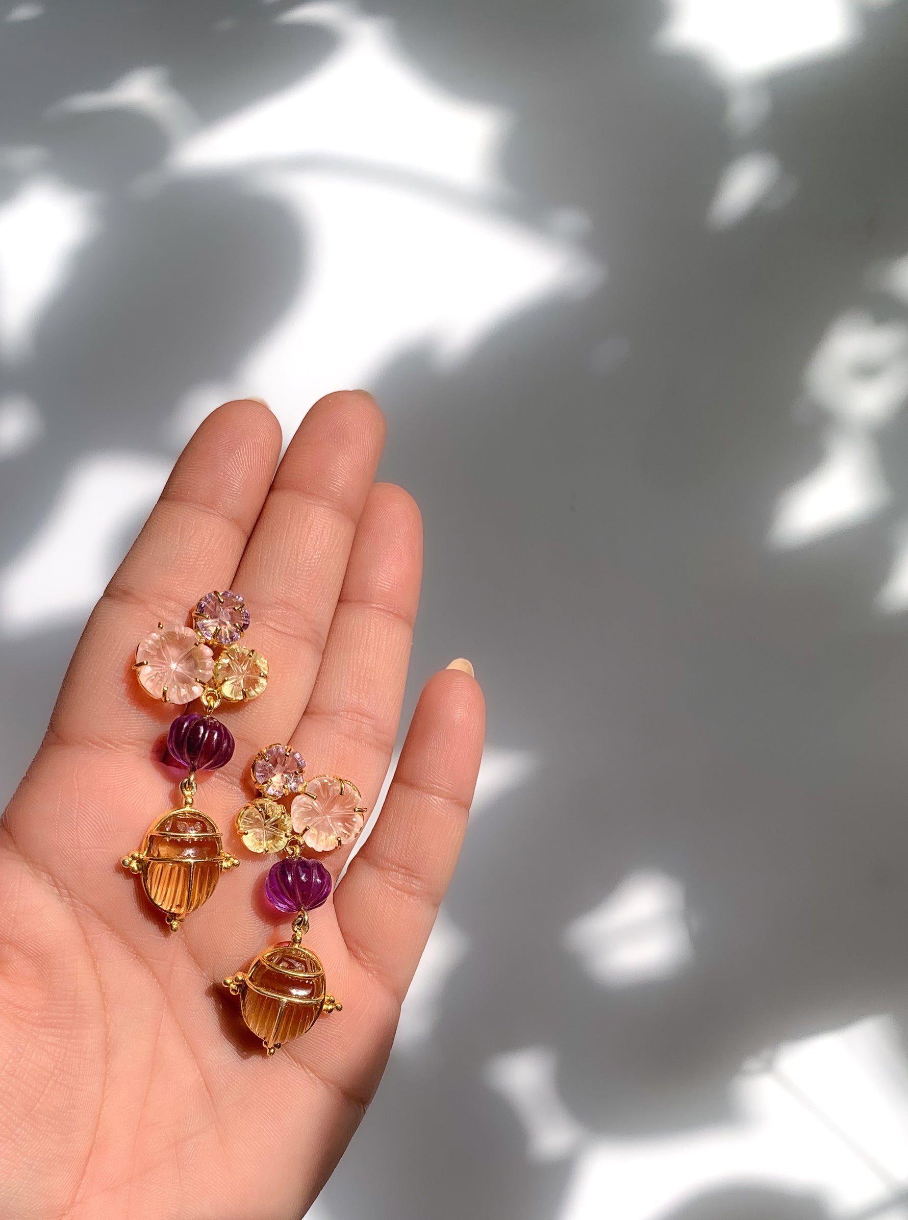 Exquisite natural Citrine beetles, amethyst melons, bouquet of Topaz and Quartz floral. Set in a gold dipped sterling silver frame.