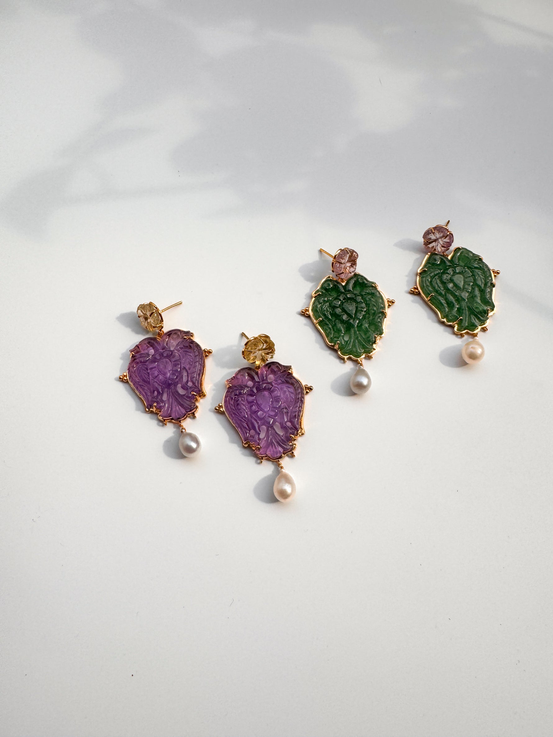 Hand carved birds in Aventurine with Amethyst flowers. Set in a micron gold dipped sterling silver frame.