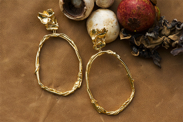 This collection explores dialogues from past explorations & serves as a bridge to our Spring Summer '20. With statement chokers & earrings, minimal earring studs, chunky hoops & cuffs, it is ideal for a cocktail evening. Each piece has been personally sculpted by hand and finished by skilled Indian artisans for you.100% handcrafted in India.