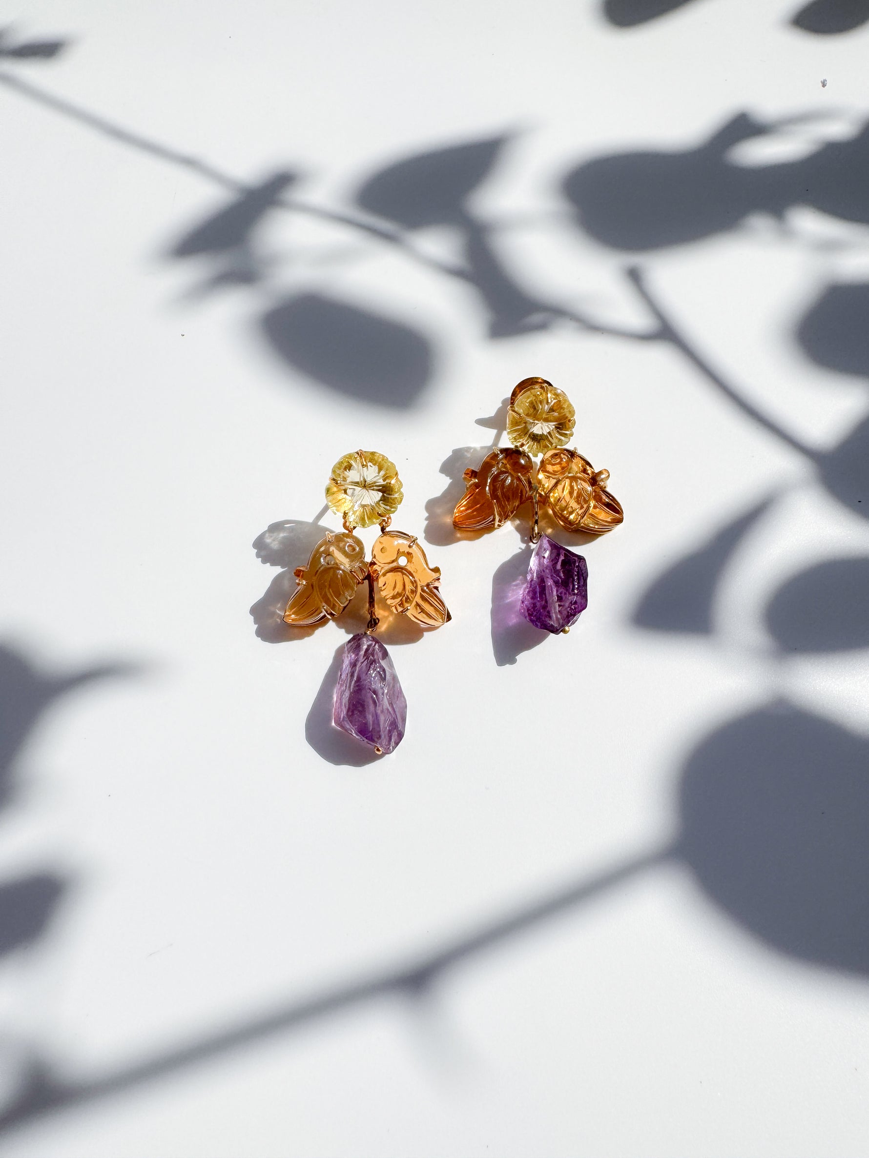 Contemporary earrings with citrine hued parrots and rough cut amethyst hued quartz stone, set in gold dipped sterling silver. It's a beauty with your occasion wear.