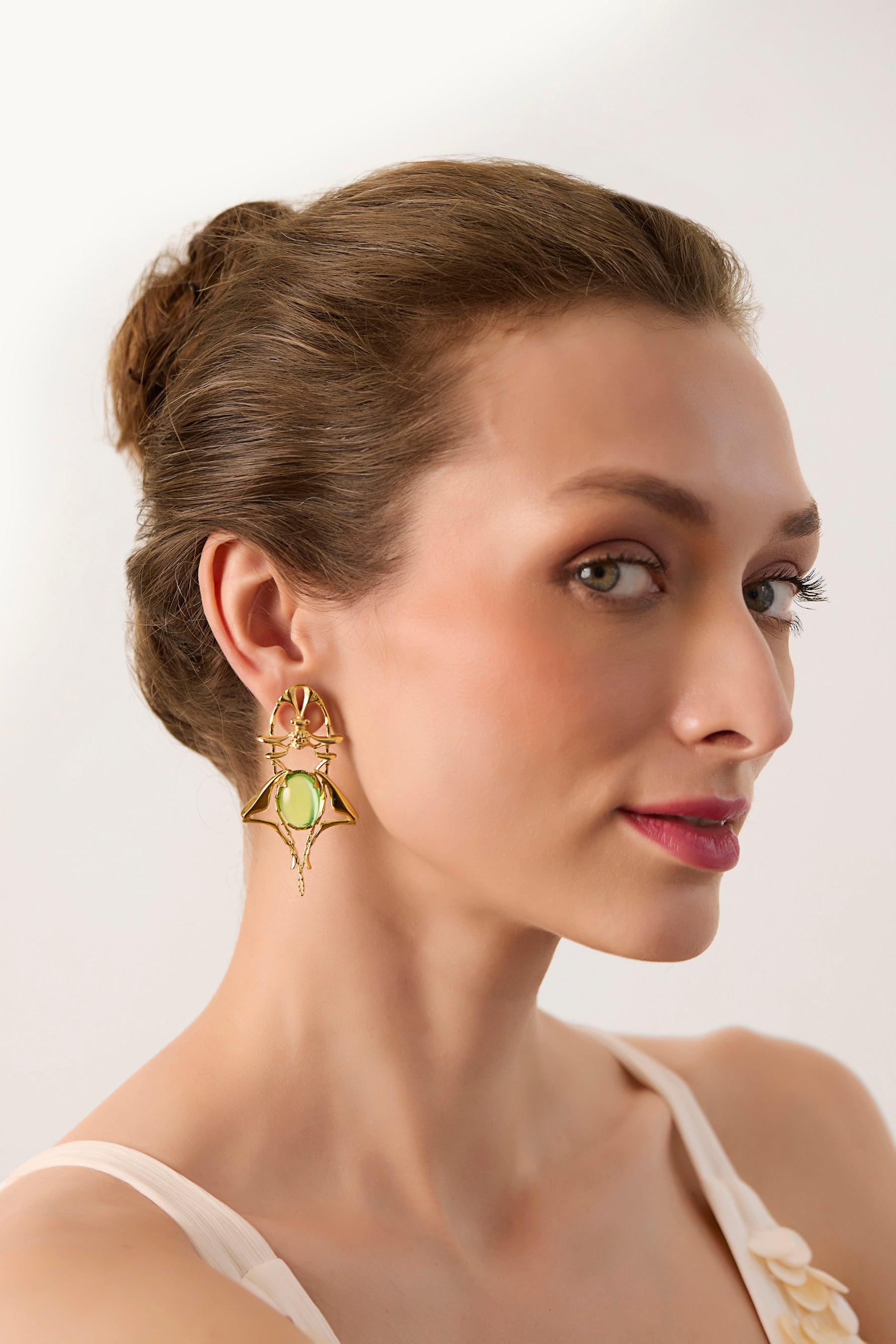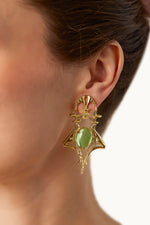 Inspired by cicadas, sculpted and detailed by hand, an eclectic motif from the Art Nouveau period . These earrings are experimental and the pop of olive lifts the mood !